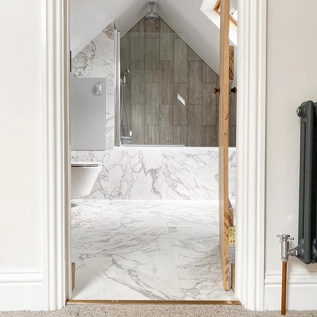 A bungalow extension with a loft conversion creating space for this bathroom - from the home of @cedar.tree.house on Instagram