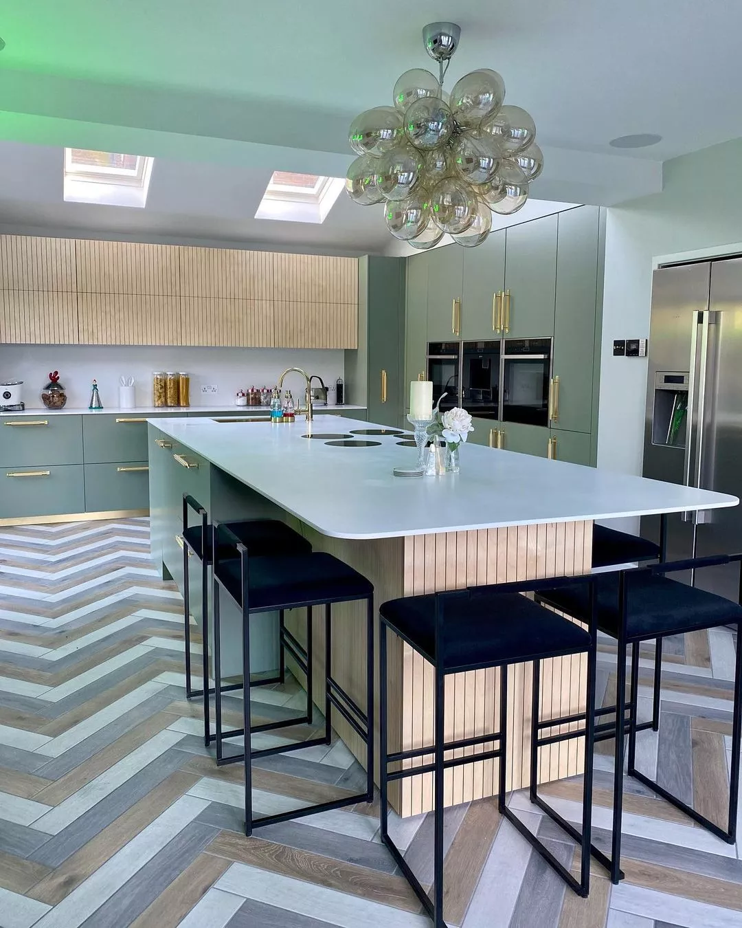 We love everything about this completely unique green kitchen in the home of @peacockfinds on Instagram. The bold wallpaper works so well with the green kitchen units, the stunning pink herringbone tiles and oak flooring.