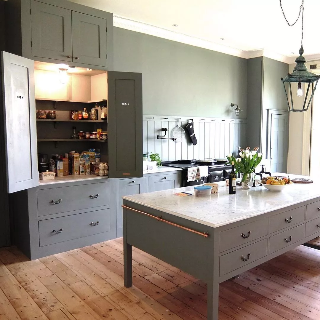 Green kitchen from the home of @peacockfinds and image by @beautifulhomesinthenorth. Cabinets painted in Green Smoke by Farrow & Ball.