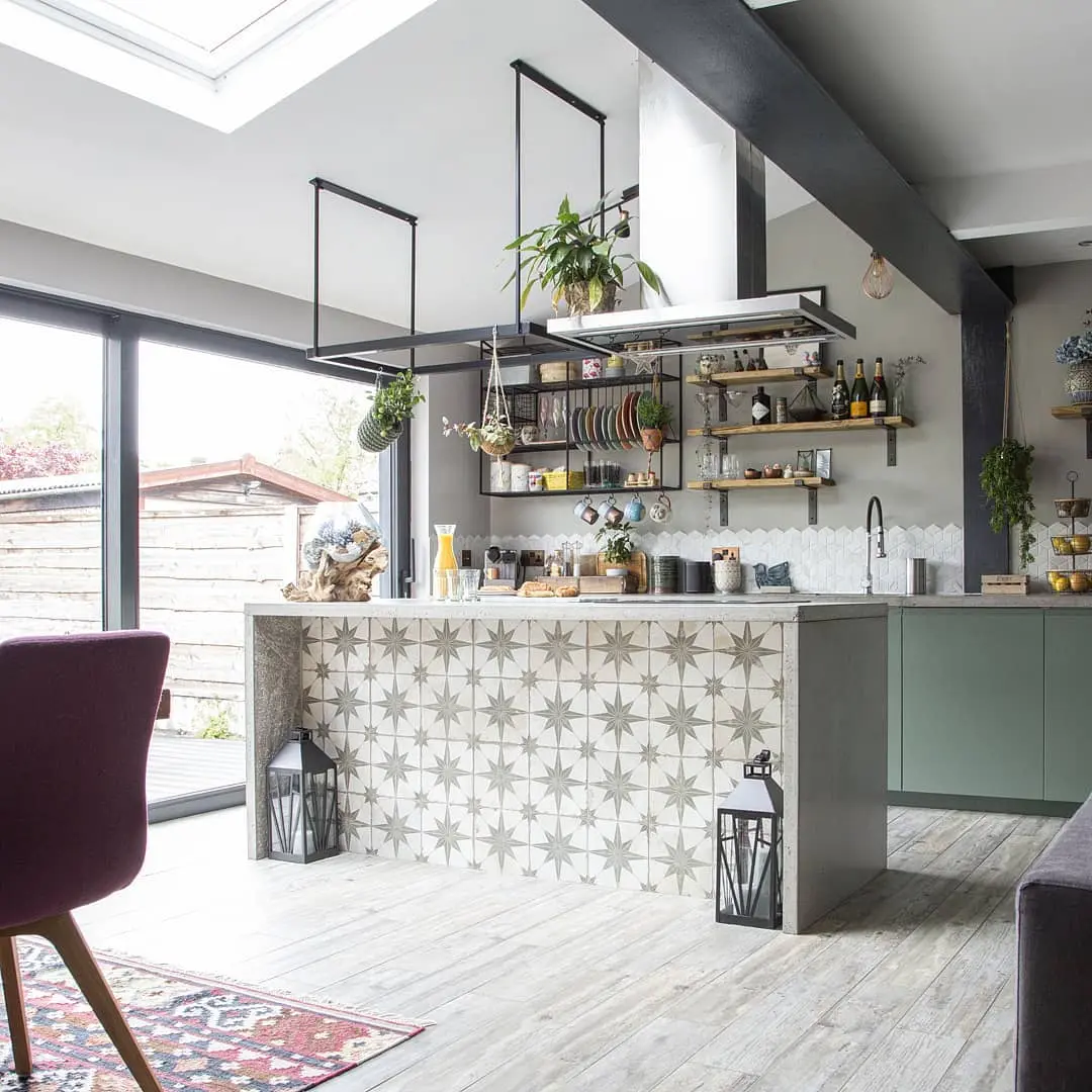 The green kitchen units blend seamlessly with the tiles on the island unit and concrete worktop, looking very subtle in this kitchen. The accessories and abundance of plants also work so well in this kitchen, adding to the natural look. Perfect inspiration if you want a twist on the popular industrial look!