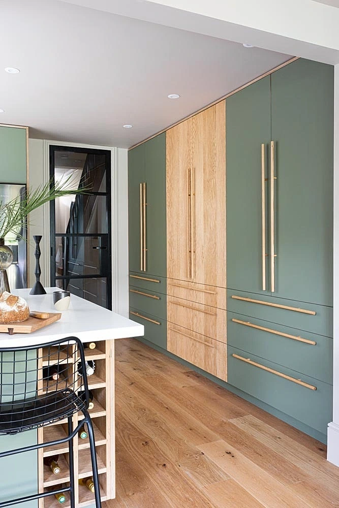 This olive green kitchen by Wood Works Brighton is beautifully combined with the fluted oak pantry, long oak handles and solid oak flooring, giving a paired back natural look.