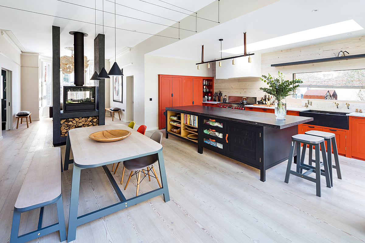The bold orange is amazing and looks wonderful teamed with the chunky island unit. It's a strong kitchen with bags of personality and can easily be re-painted in years to come.