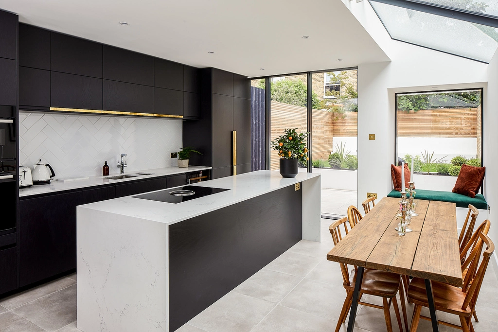 This rear extension idea for a terrace property works so well and it's a style that we see a lot. The skylights and sliding doors allow the natural light to flood into the kitchen area, whilst the white painted walls and light worktops let the light to bounce around. The vaulted ceiling also adds to the feeling of space and further maximises the light.