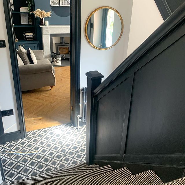 Hallway and stairs with the dark painted woodwork and feature tiles