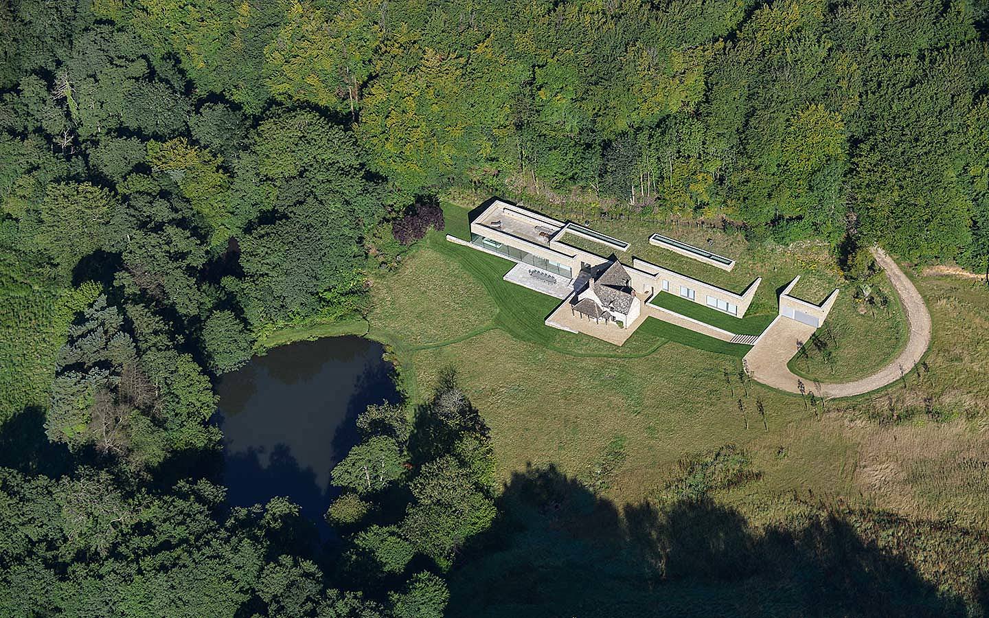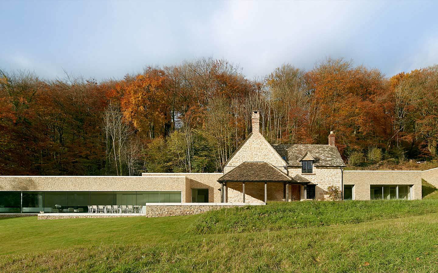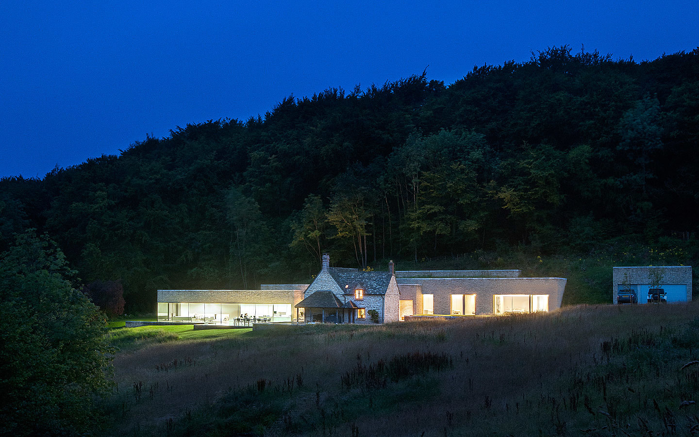This contextual country house consisting of a restored and updated gamekeeper’s cottage and an innovative series of fresh, inter-connected pavilions tucked into the landscape immediately behind it. Together, they form an inviting rural escape set within a secret valley on the edge of the Cotswolds, surrounded by woodland.