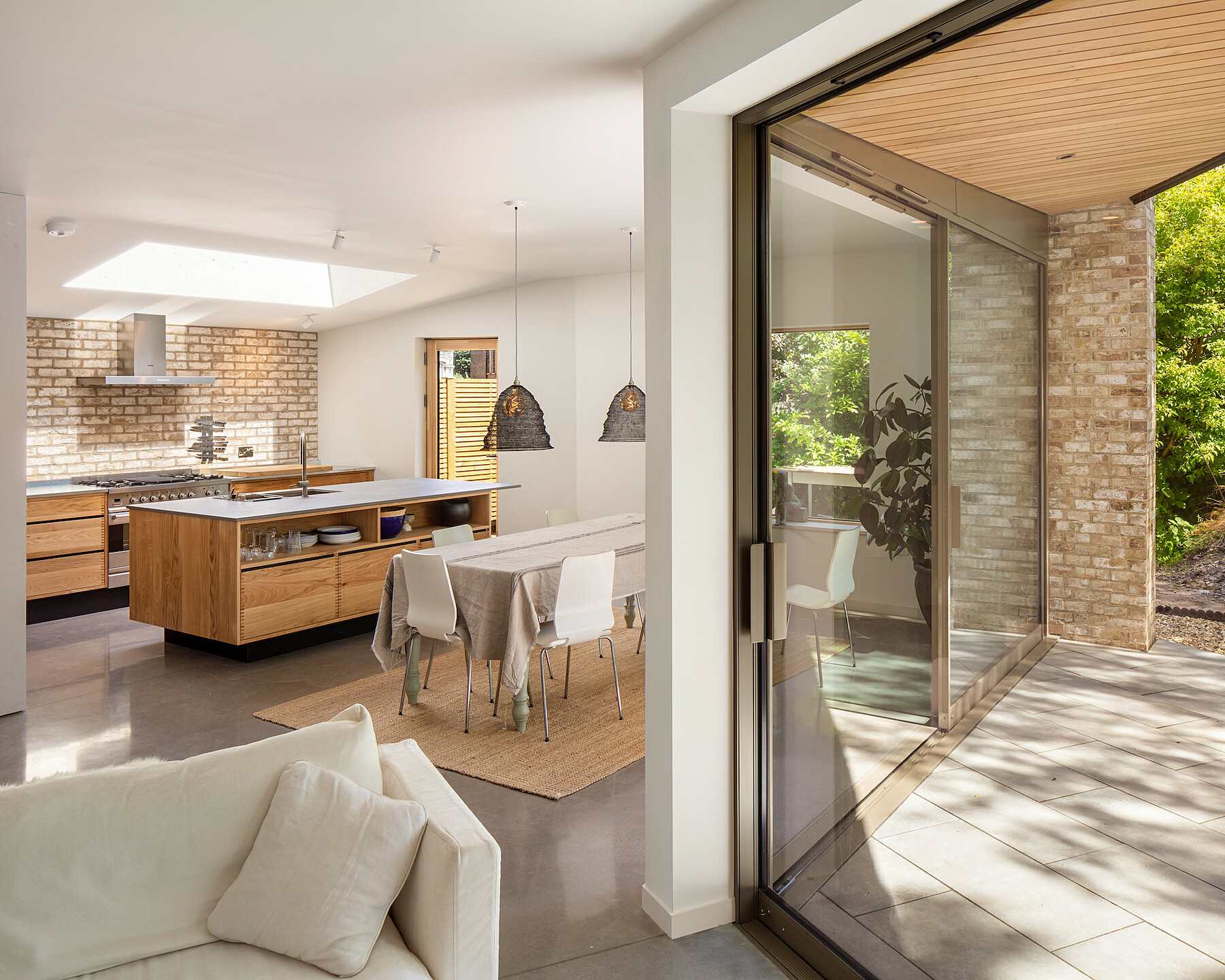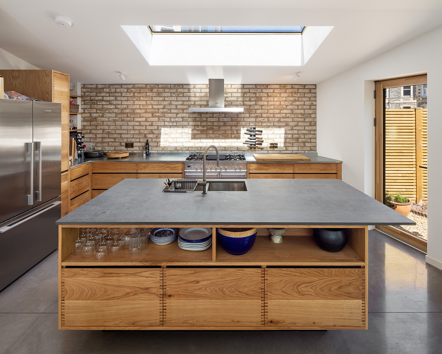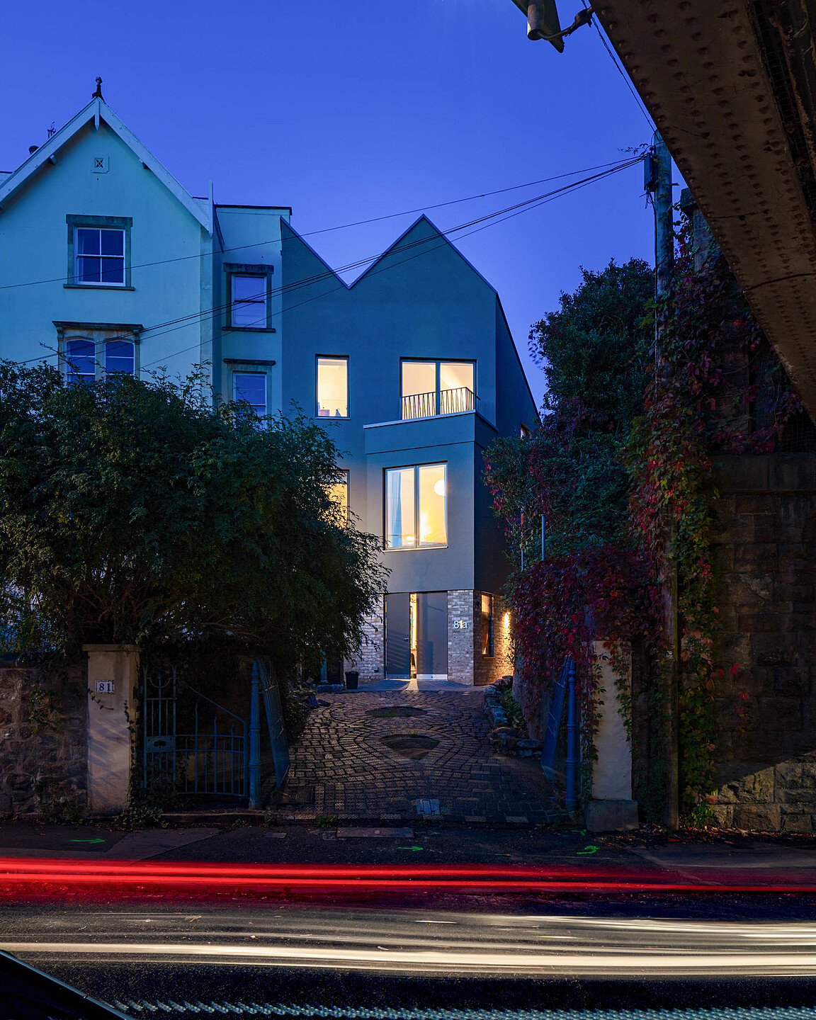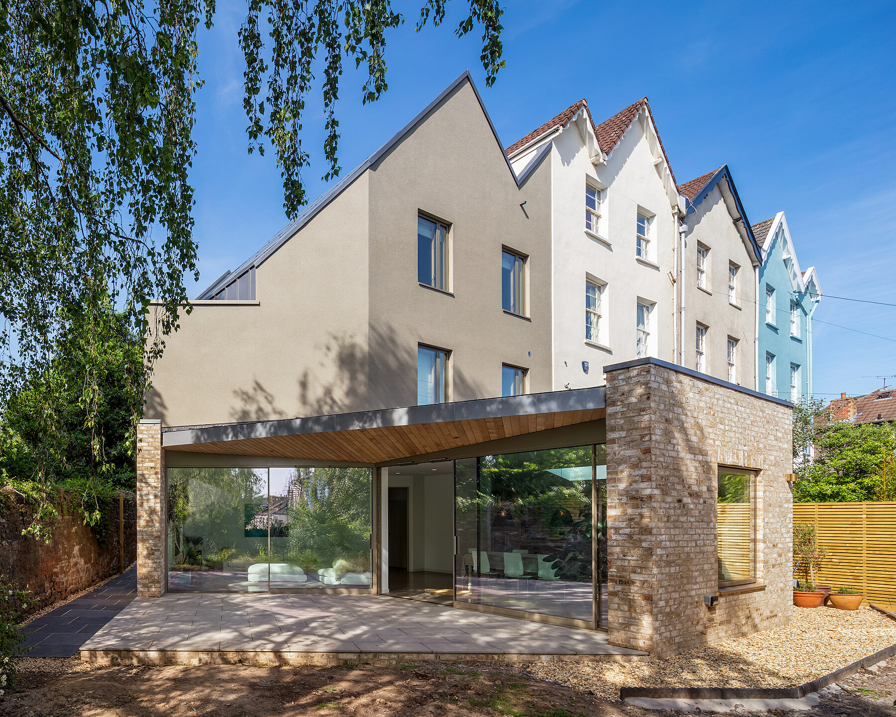 This project is for a new private house that sits on a triangular site between terrace of gable fronted Victorian houses and a railway embankment in Redland, Bristol. The house uses the unusual site geometry to create a dynamic series of spaces over three storeys. The house’s roof form echoes that of the adjacent terrace. At ground floor the house opens up to maximise the connection with the garden at the rear.
