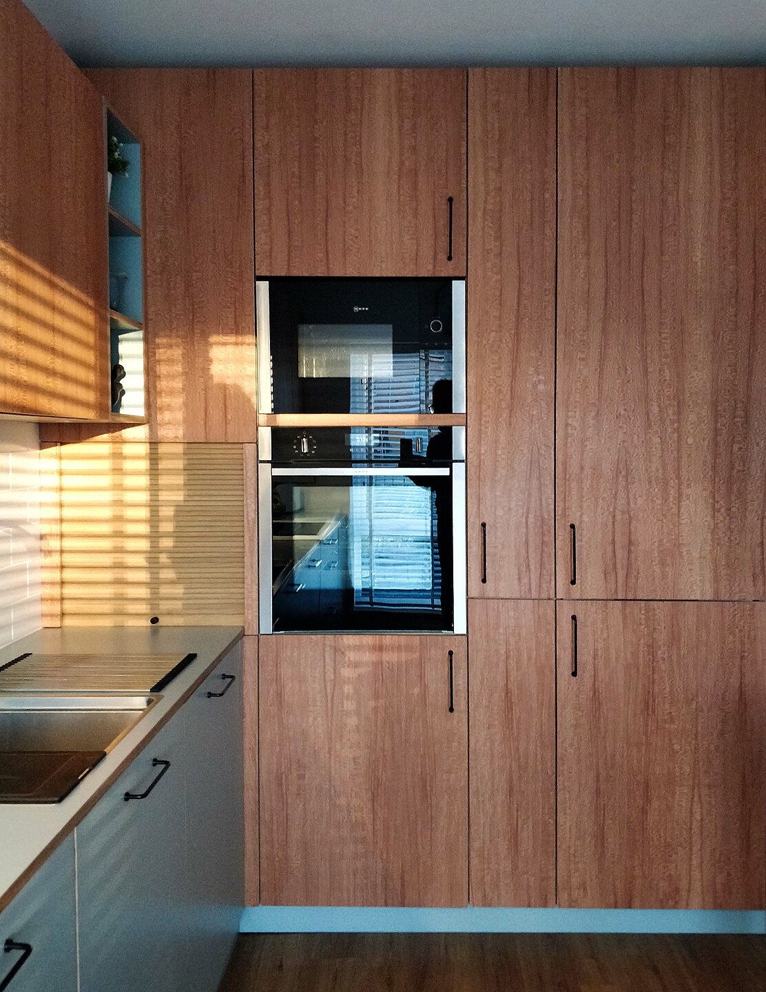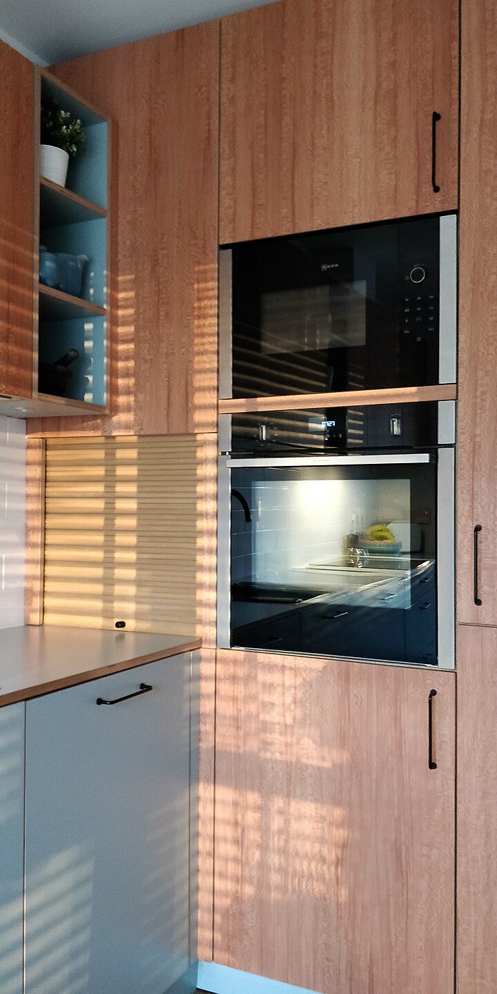 Fomica Fossil laminate and London Plane real wood veneer frontals feature on this simple kitchen for a local client. Plyko designed this kitchen to maximise the space available. The kitchen features pull-out corner storage, slide-out coffee station, pull-out vegetable baskets, breakfast bar area, open bookcases and pull-out waste recyling.