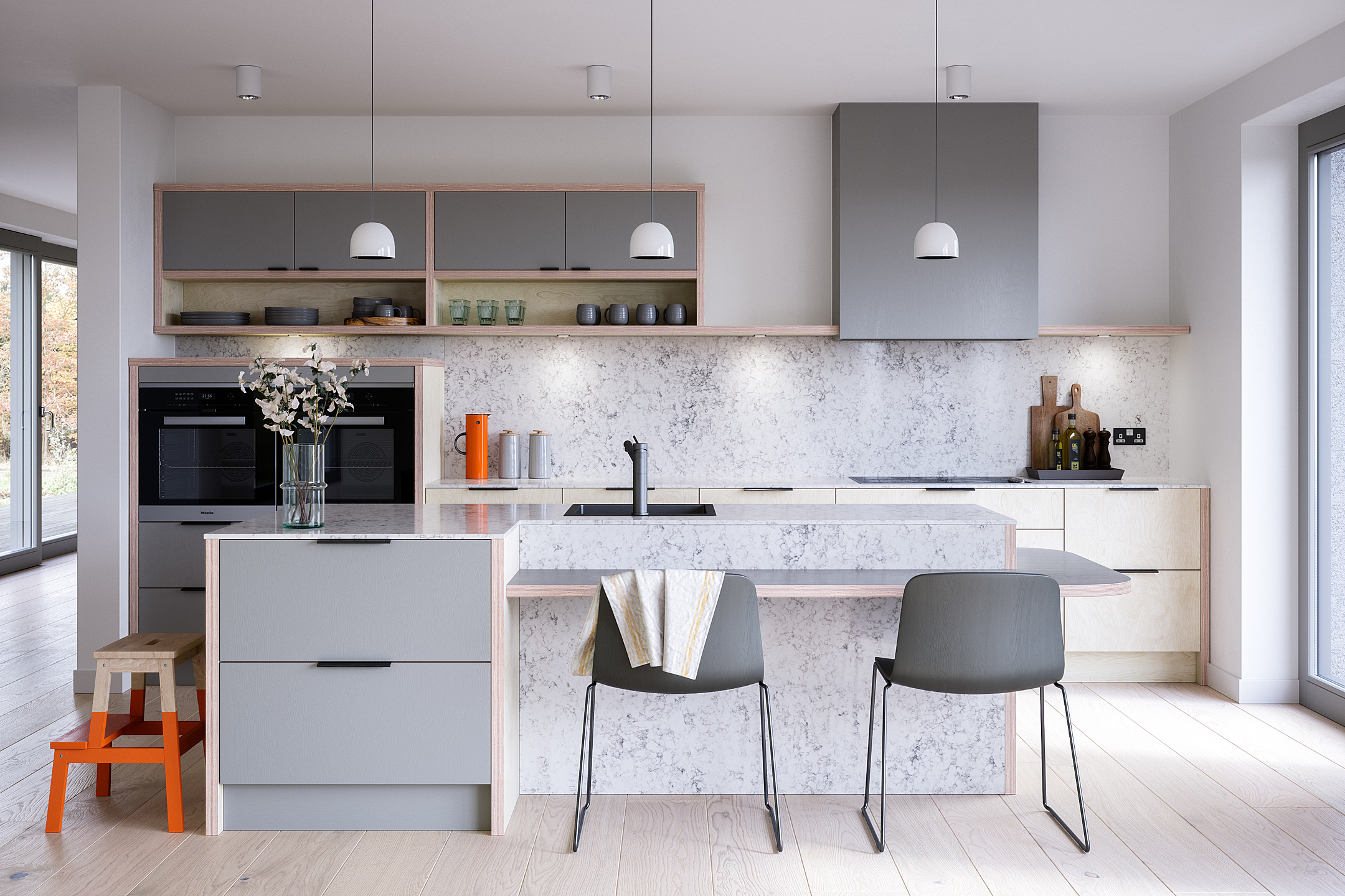 Plyko design and manufacture beautiful birch ply kitchens bedrooms and living room furniture.