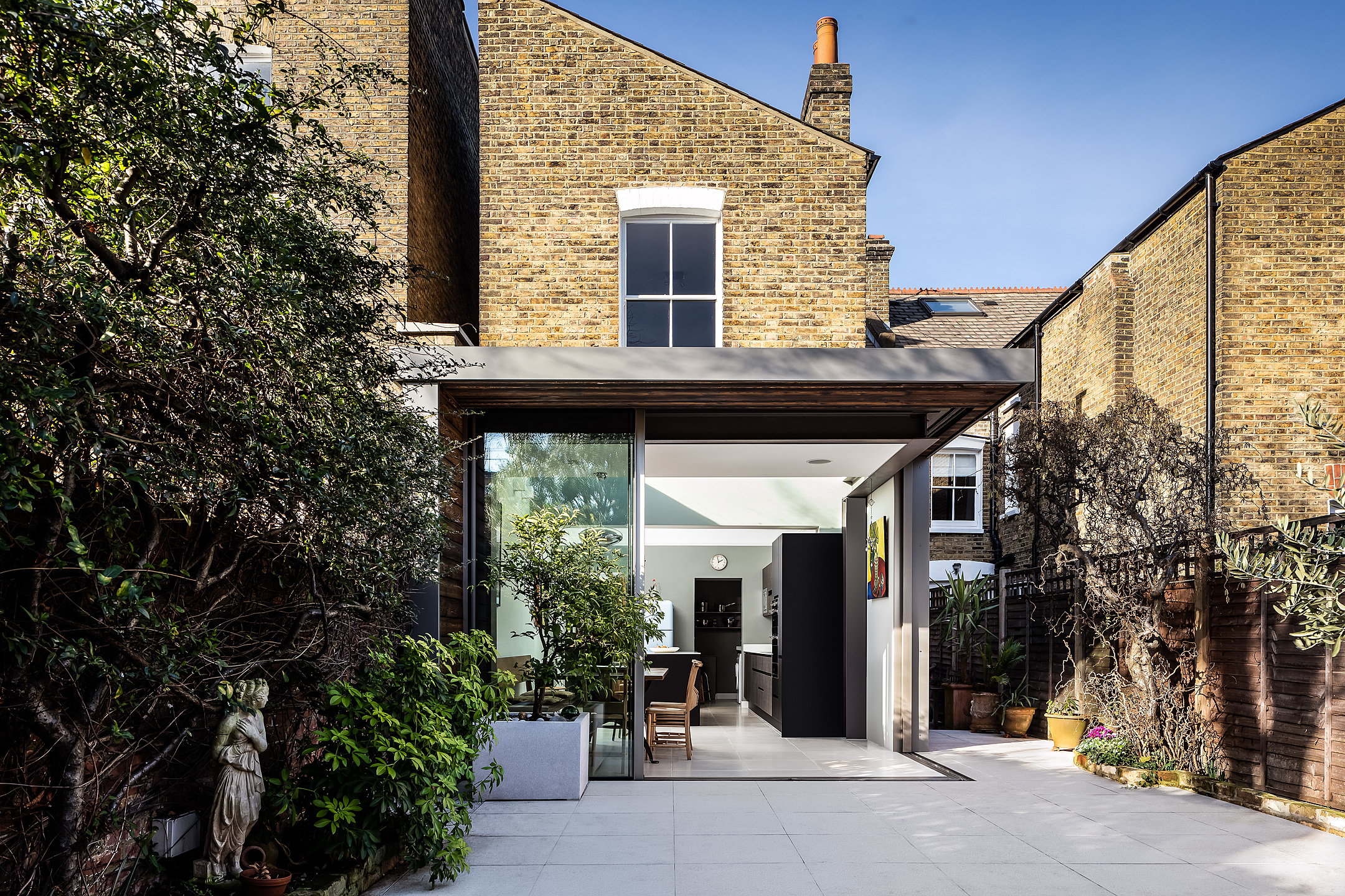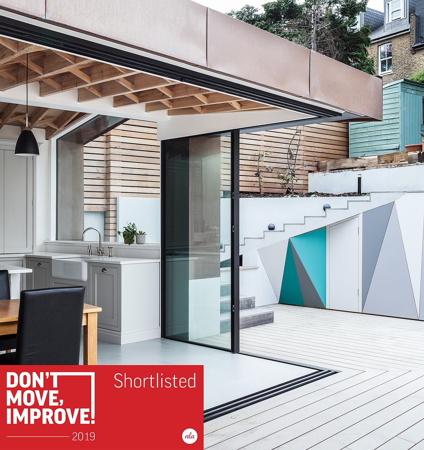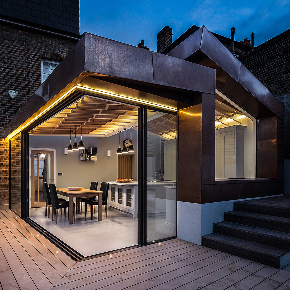 House refurbishment with rear kitchen/ diner extension. An innovative structural design to allow lots of natural light and a great view of a redesigned garden. Open corner sliding doors unifies the dining area and external terrace to make the space feel three times as big, even when the doors are closed Copper cladding provides a durable, beautiful finish that ages gracefully complimenting the traditional host building. The project was shortlisted for Don't Move Improve Award 2019