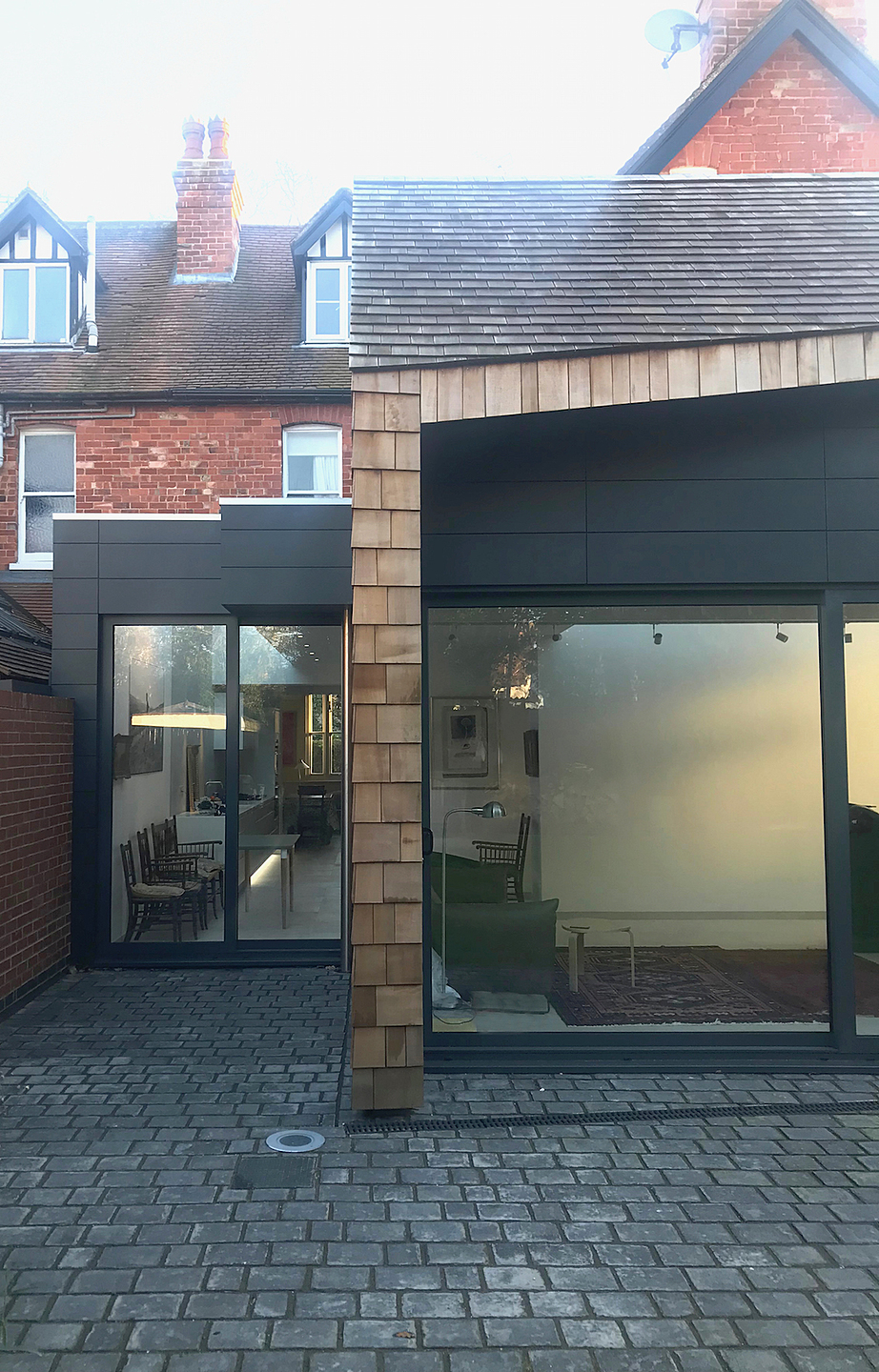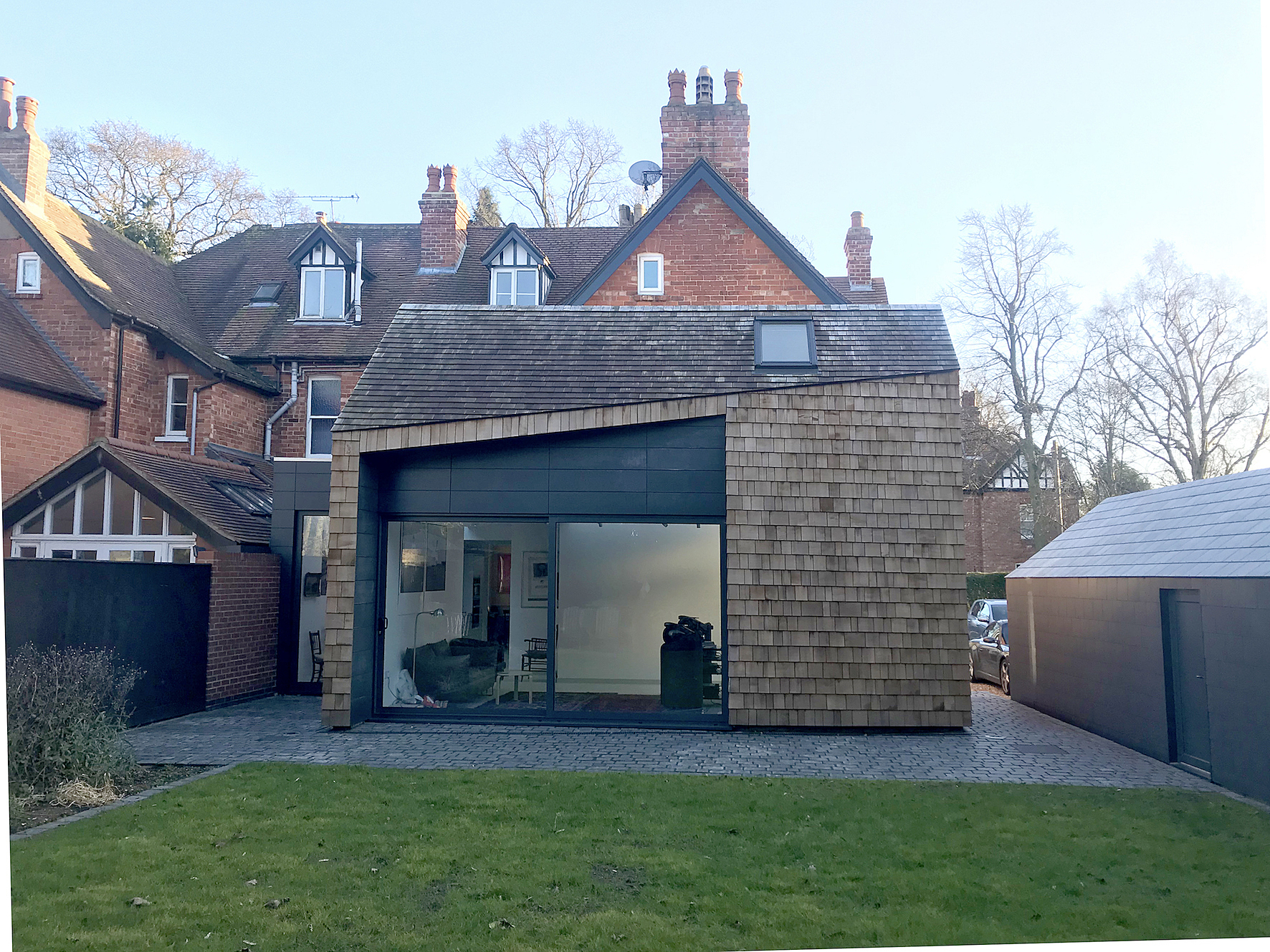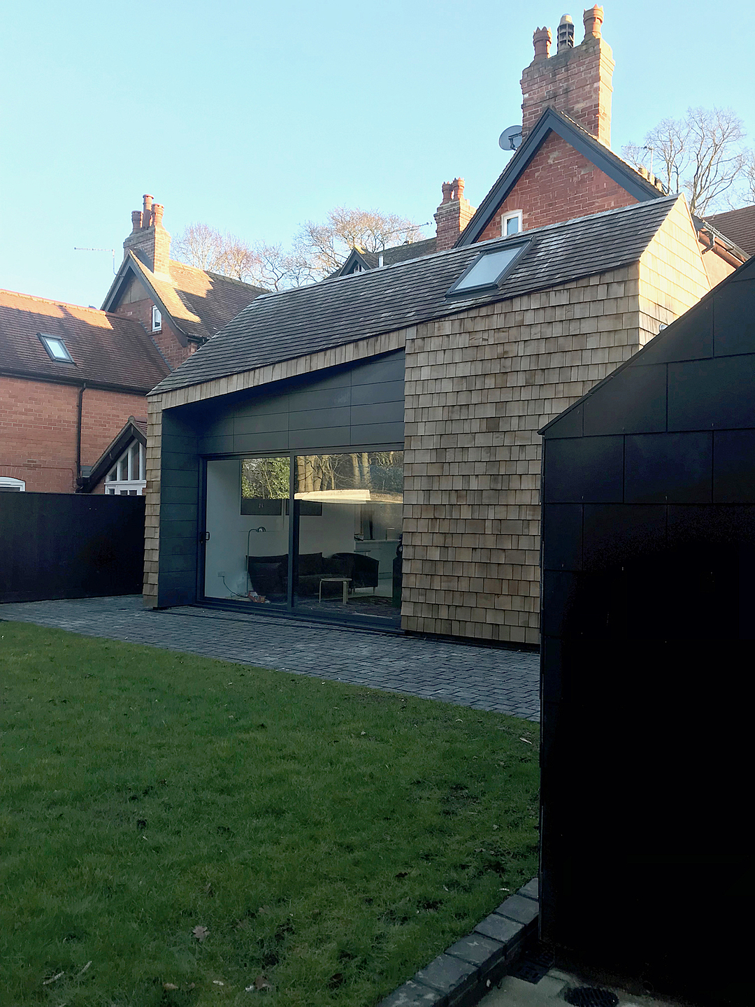 This ADSDF Architects project epitomises a sensitive and contemporary intervention into historic conservation area of Woodhall Spa, a victorian spa town in Lincolnshire. The materials and massing compliment the large dwelling originally designed by Architect Adolphus Came in the mid 19th century. The new extension is north facing and optimises the daylight into the deep plan of the house. The concept for the project is to connect to the garden and create a dramatic contrast to the existing house