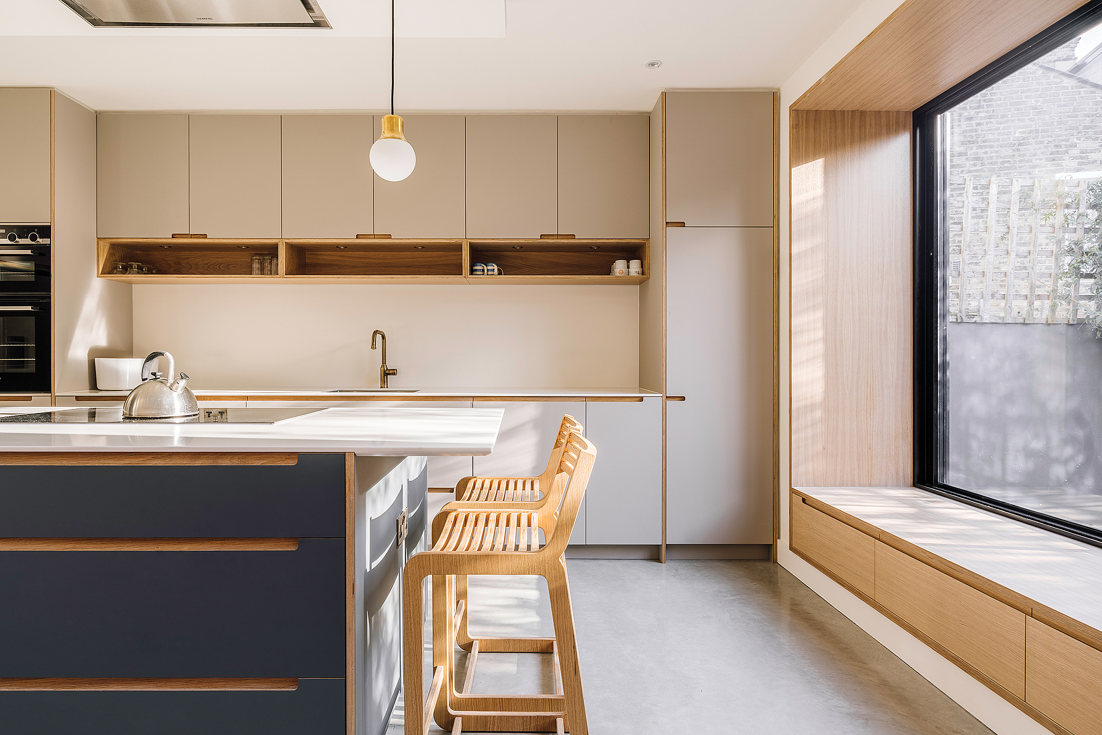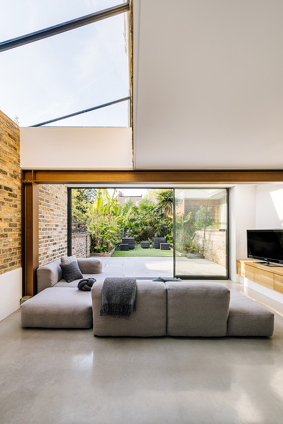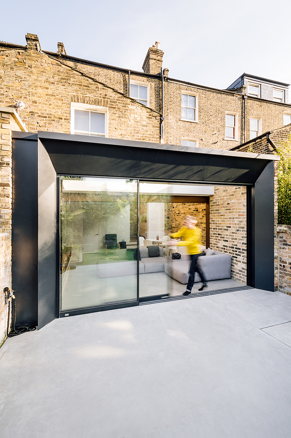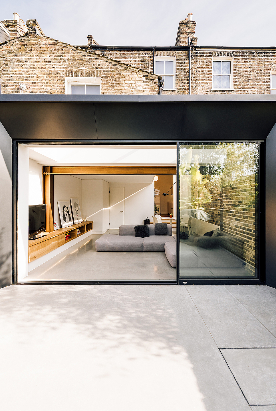 Having moved from a substantial loft apartment to a Victorian terrace, the clients were keen to recapture the open sense of space and light their former home had offered. The brief called for an open space that could be adapted for either entertaining, dining or relaxing simply by moving loose furniture. To achieve this, the kitchen was moved back into the centre of the house, leaving the new room free of fixed joinery except for a single run of low level solid oak units