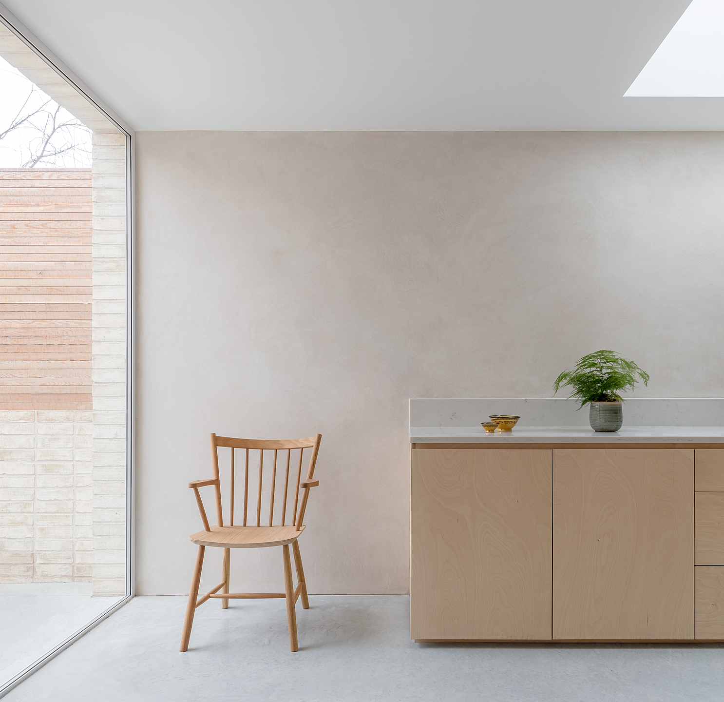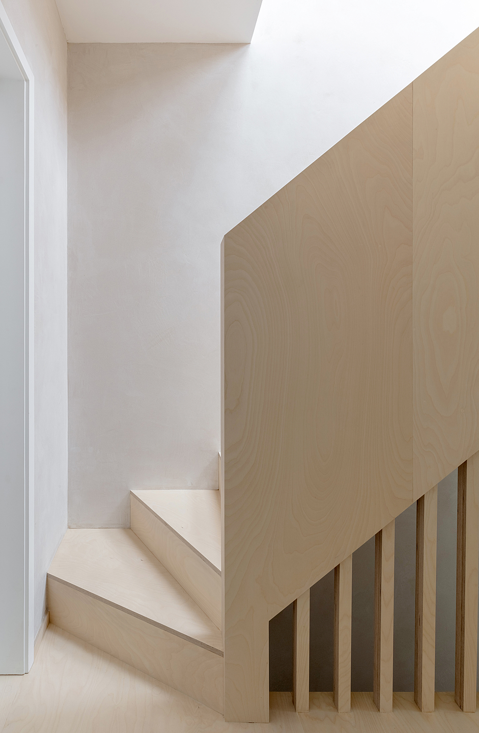 The clients wanted a calm home and refuge from busy London life. Roslyn Road was transformed most notably on the ground floor; connecting all the spaces, and adopting a restrained material palette of London stock-style brick, ash-white concrete, light clay walls and birch plywood.