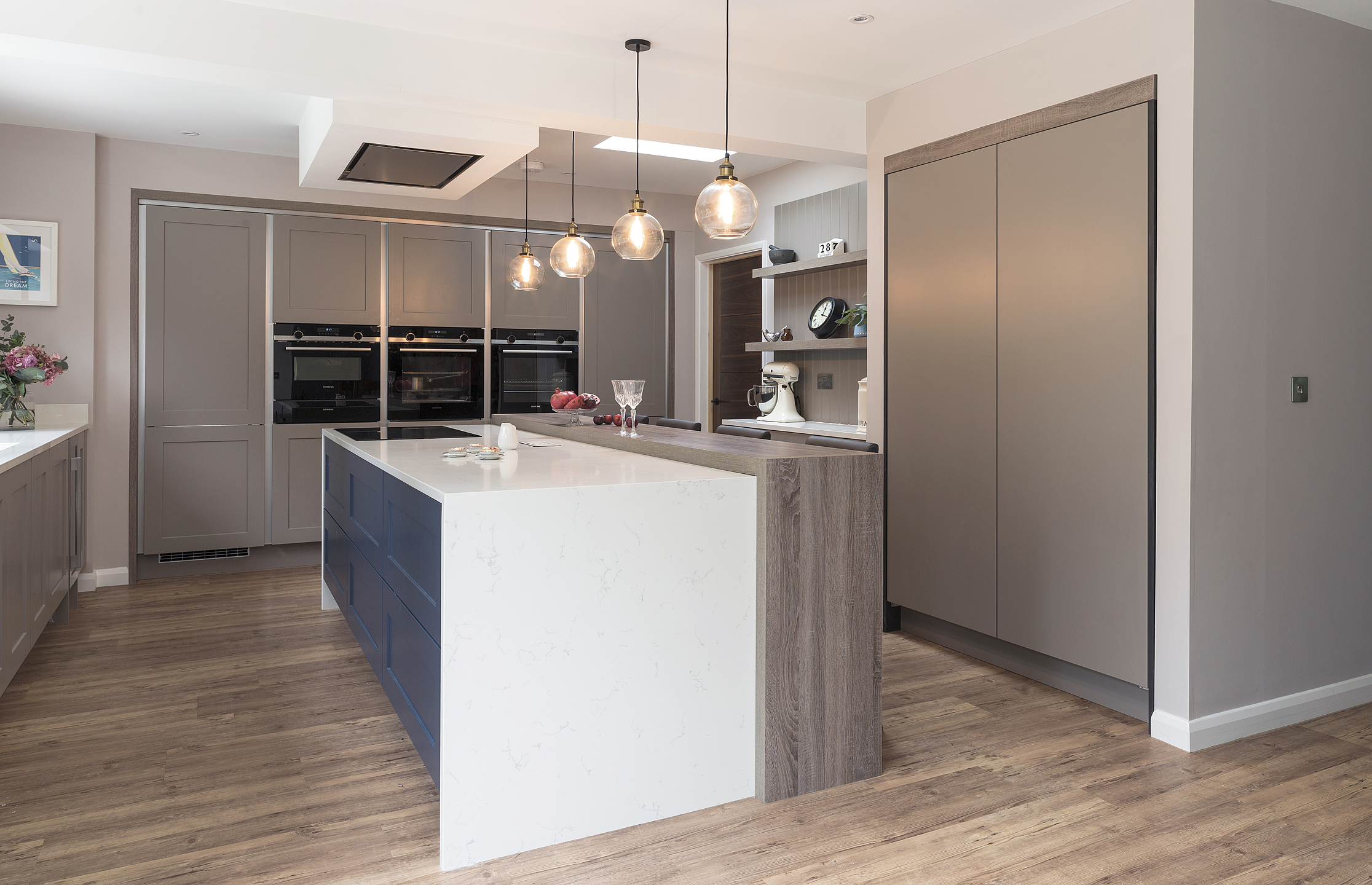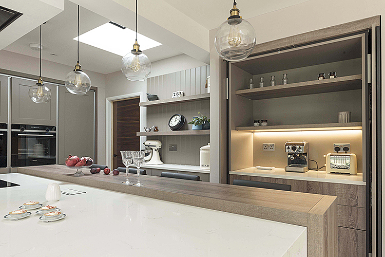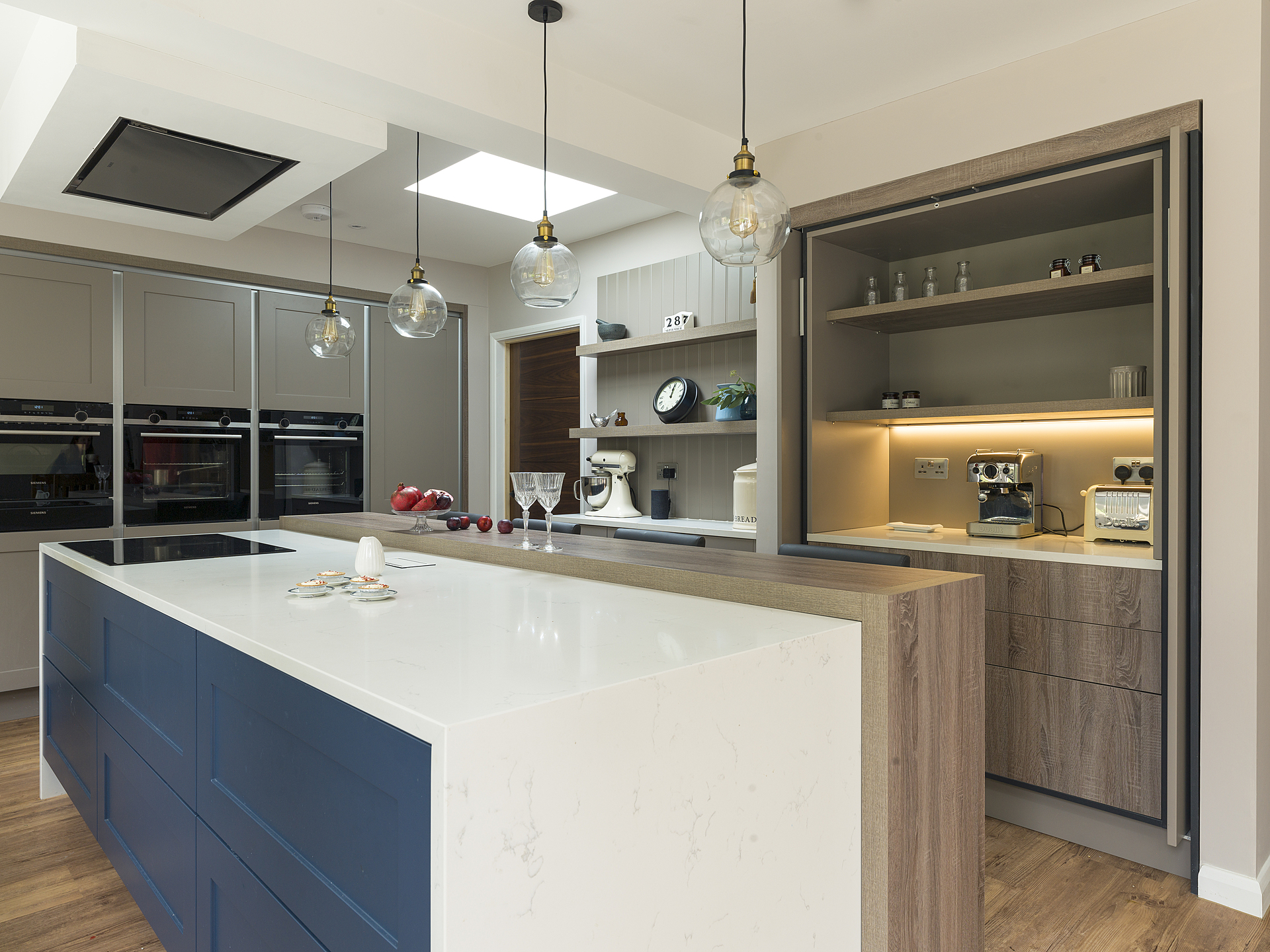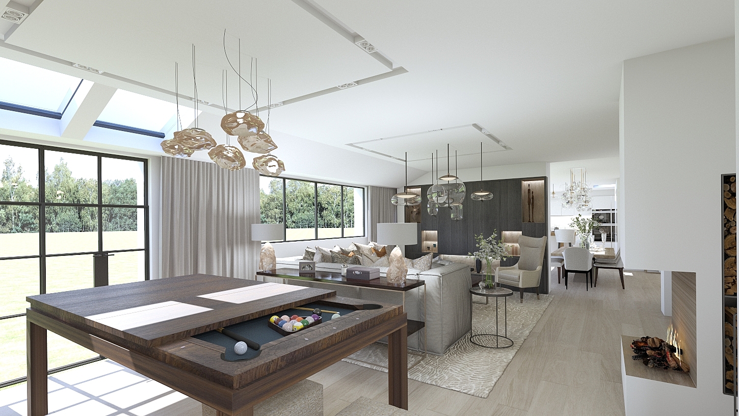 We recently worked on this four-bedroom family house extension in Wheathampstead, Hertfordshire, focusing on the design and fit for the open plan kitchen, dining and living space. The classic Shaker-style kitchen is handleless and effortless, with bespoke Charleston Grey and Stiffkey Blue Island Navy paint finish. Bespoke Quartz worktops make for a rustic dining area, with raised bar stools to submerge in the garden view. In the living space, the pool table transforms into a sleek dining room ta